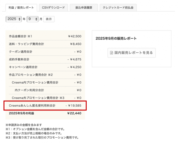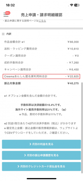 Creemaあんしん匿名便の利用料は売上振込時に差し引かれます。