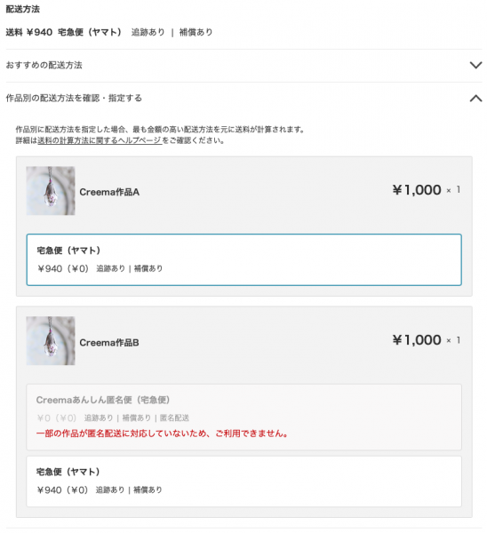1.作品に「Creemaあんしん匿名便」の配送方法が設定されている場合