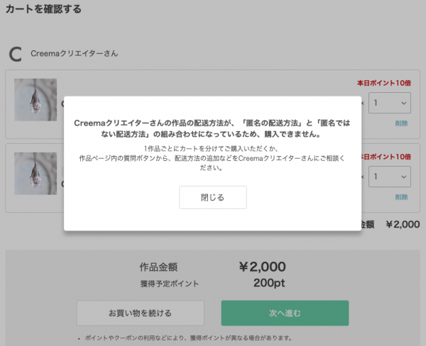 同じ出店者から複数の作品を同時に購入する際には、すべての作品に「Creemaあんしん匿名便」が設定されていれば、「Creemaあんしん匿名便」を利用することができます。