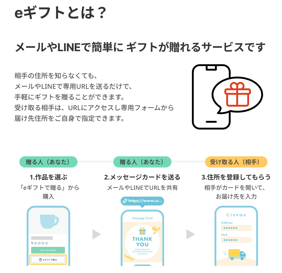eギフトは受取人の詳細な住所等を知らなくても、作品を贈ることができるサービスです。