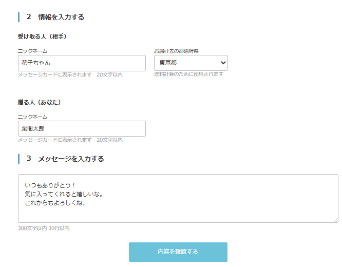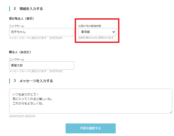メール等で受取人にURLを送り、届け先情報を登録してもらいます。