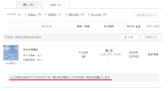 eギフトのお取引は、メモ欄にその旨が自動で記載されています。
