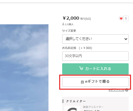 作品ページのカートボタンの下に「eギフトで贈る」のボタンが表示されています。