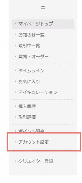 Q. 登録情報を変更したい場合はどうしたらいいですか? A. 変更可能な項目は、以下となります。 メールアドレス パスワード ソーシャルアカウント連携 クレジットカード情報 メール受信設定 特定商取引法に基づく表記(出店者のみ) 1.アプリ/スマホウェブからの変更方法 左上三本線>設定>をタップ 2.PCからの変更方法 マイページ右上のニックネームをクリック アカウント設定をクリック