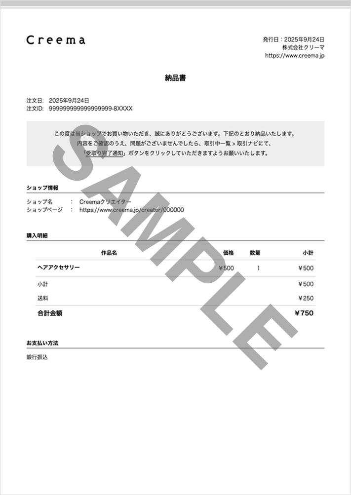 ※納品書には金額の記載があります。ギフト用などでプレゼントするお相手に直接送付する場合は、同封しないようご注意ください。