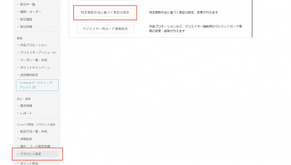 特定商取引法に基づく表記の設定ページは、マイページ>アカウント設定>特定商取引法に基づく表記の設定よりアクセスください。